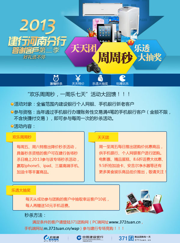 (1)活动期间内,具备秒杀资格的客户可在建行各场秒杀日晚上20:13参与该专场秒杀活动,赢取iphone5、ipad、三星高端手机、加油卡等丰富商品。
