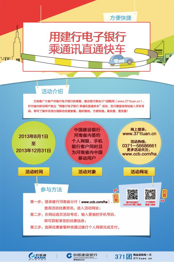 您的手机套餐又有新优惠了!为答谢广大客户对建行电子银行的厚爱,建设银行联合371团购网(www.371tuan.cn),针对省内移动用户推出“用建行电子银行乘通讯直通快车”活动,只需登陆网站输入手机号码,即可了解到您的手机套餐还能享受哪些额外优惠,随时随地,方便快捷,真实惠,更优惠!