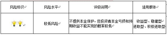 本期产品为非保本浮动收益型理财产品,不保证本金和收益,请您充分认识投资风险,谨慎投资。本期产品期限109天(中国建设银行有权对本期产品进行展期和提前终止),存续期内产品不接受申购或赎回申请。本期产品内部风险评级级别为2盏警示灯 ,风险程度属于较低风险。最不利情况下,资产组合无法回收任何本金和净收益,客户将损失全部本金。产品适合于收益型、稳健型、进取型、积极进取型客户。